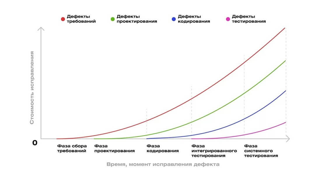 Зависимость стоимости исправления ошибок от момента их выявления хорошо показана на графике: